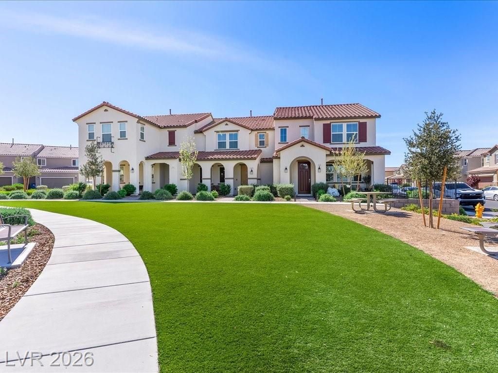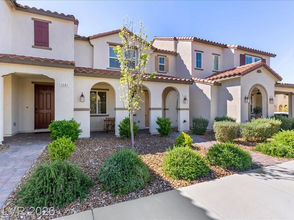 The charming cobble stone covered porch welcomes you to this beautifully maintained townhome located in the heart of Inspirada. Step inside to a spacious great room with cozy fireplace that seamlessly flows into the upgraded island kitchen with a breakfast bar, pendant lighting, granite countertops, custom cabinetry, and SS appliances - ideal for easy living and entertaining. Generous primary suite w/ walk-in closet & ensuite bath featuring an oversize shower, separate soaking tub & dual sinks. Spacious secondary bedrooms, & convenient upstairs laundry room with sink and cabinetry plus Tankless Water Heater. Enjoy the ease of an attached two-car garage with direct home access. Outside, enjoy the lush green common areas, BBQ and picnic spaces, playground. Living in Inspirada means access to exceptional community amenities: Clubhouse, Community Pool, multiple parks, including a dog park. play areas, basketball & tennis courts & more. Be sure to explore the 3D self-guided virtual tour!