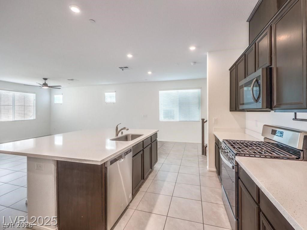 This bright 2,719 sq ft cul-de-sac home has terrific curb appeal and an open-concept layout! The stunning kitchen features a huge quartz island, stainless appliances, and walk-in pantry. Tile floors on the first level. Downstairs: guest bedroom with 3/4 bath + separate half bath ? perfect for entertaining! Upstairs: spacious loft, 3 more bedrooms, full bath, and primary suite with sitting area, dual sinks, and walk-in shower. Upstairs laundry with washer/dryer included. Low-maintenance backyard with synthetic grass and paver patio. Close to shopping, dining, parks, schools & both Nellis & Creech AFB. Gated community!